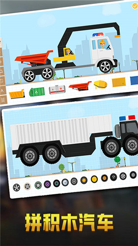 2、玩家可以通过拼积木的方式来组装汽车,比如更换不同的车子轮胎以及外形等等。