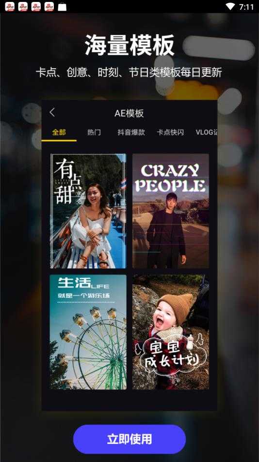 1、软件拥有不断更的丰富短视频爆款AE模板、特效主题、精美滤镜、炫酷字幕、动态贴纸等众多好玩又有趣的视频制作素材,是拍摄制作og、小视频、朋友圈视频、MV音乐相册神器。
