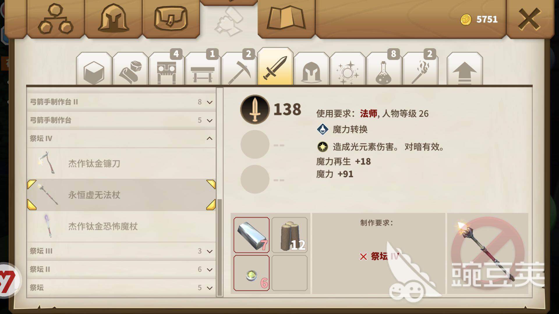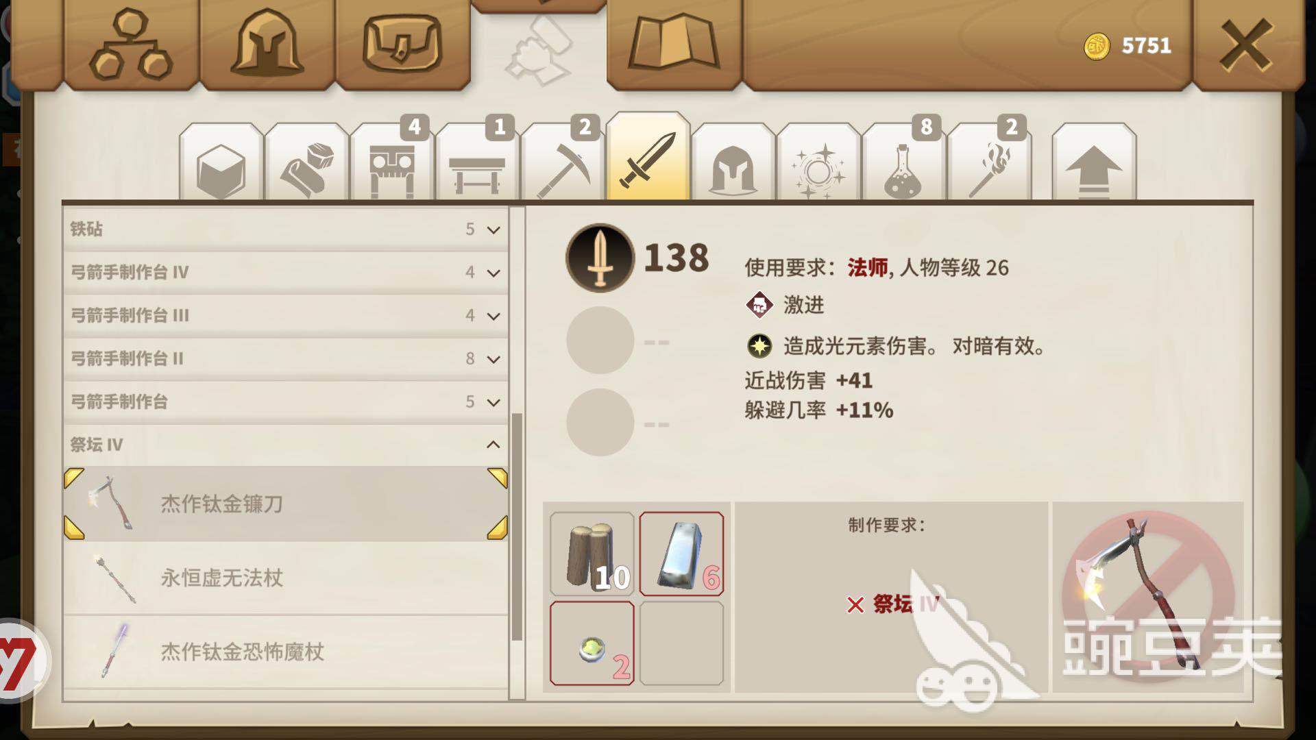 3.魔法师只要将祭坛升级到4级就有两个光属性的法杖,这两个法杖的技能效果都很差,所以平时不要携带,打不败巫师的时候可以用一下。